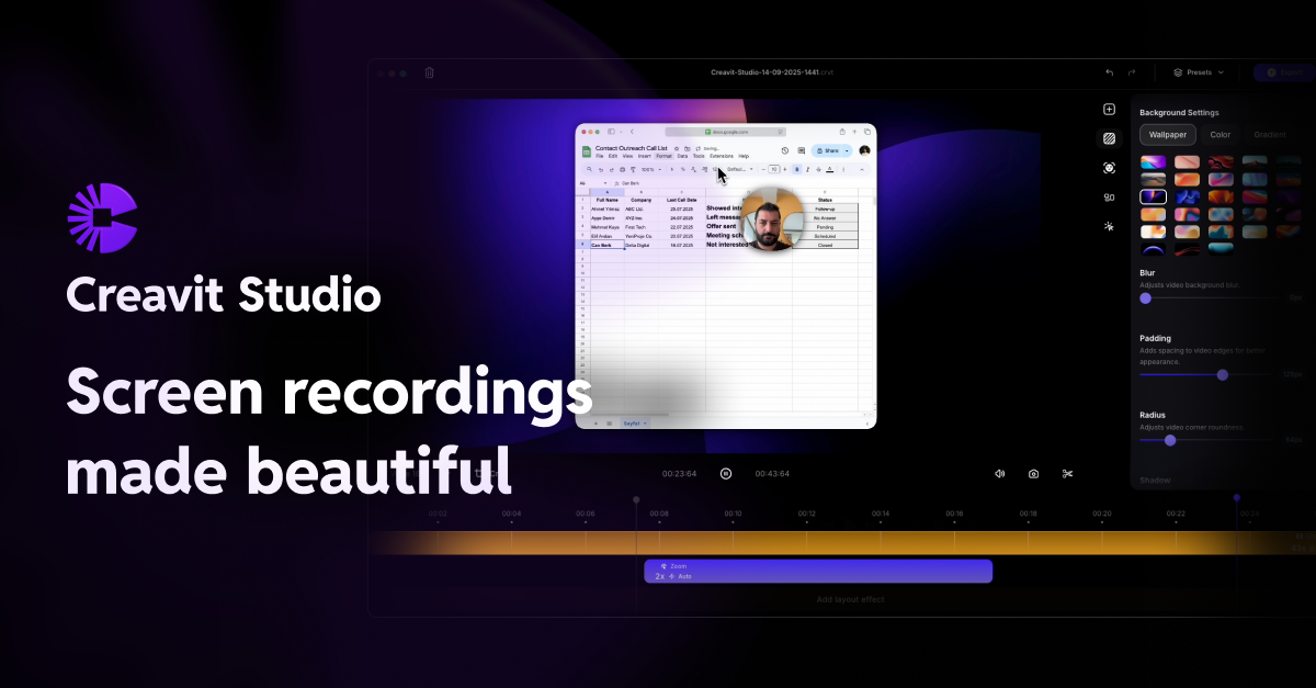 Creavit Studio is a macOS screen recording and video editing tool designed for creating professional-looking content quickly. Key features include: