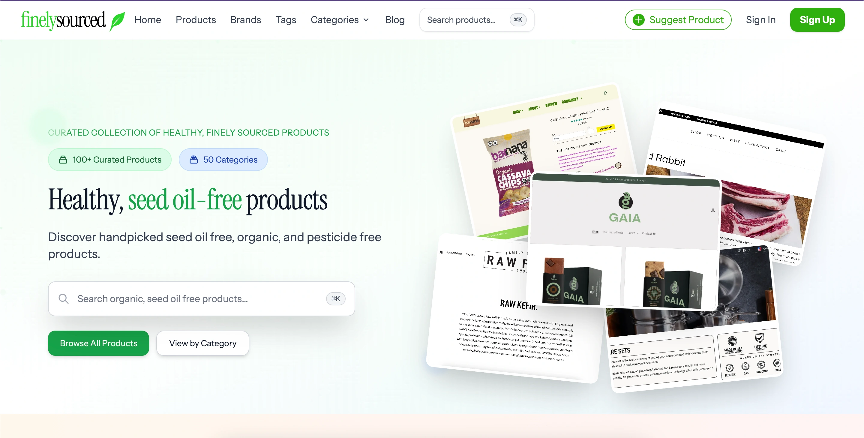 FinelySourced is a curated directory that helps users discover and explore organic, seed oil free, and non-GMO products. Key features include: