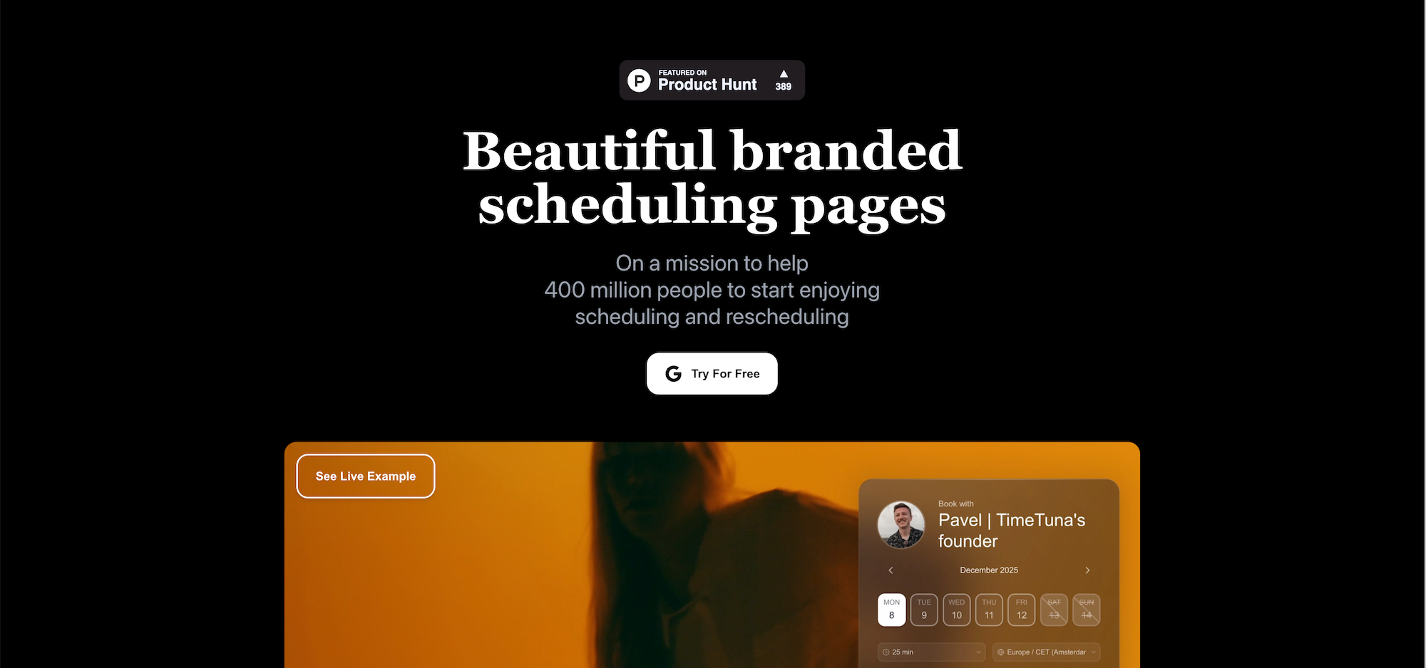 TimeTuna is a beautiful, branded scheduling page creator, designed to make booking appointments a visually appealing experience. Key features include: